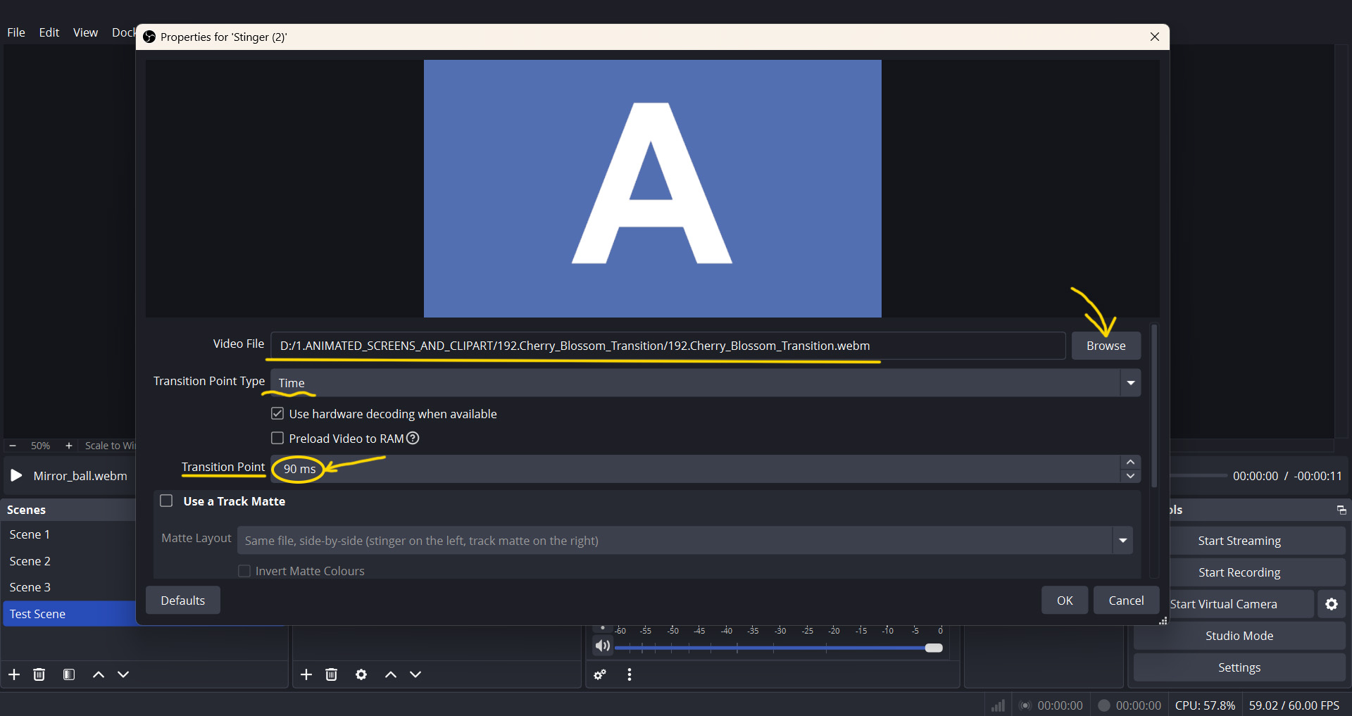 Answer: Open the Transitions dock in OBS Studio and click the “+” icon to add your file (select “stinger”, give it a name – OK – Properties for stinger – Browse – add your file). After loading, set the transition point in frames or milliseconds — this is the exact moment when the transition fully covers the screen.
