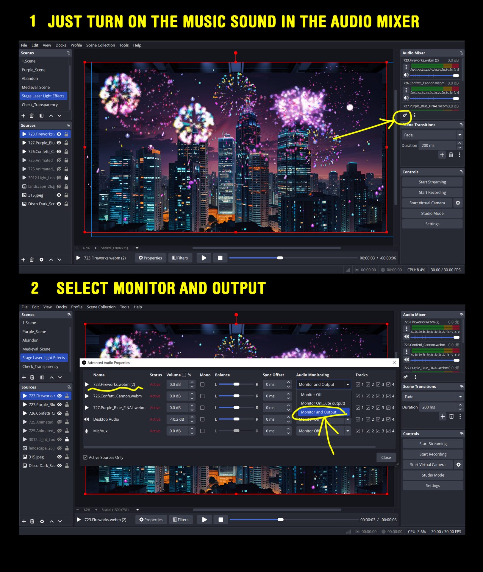 In the Audio Monitoring column, select Monitor and Output to hear the sound yourself and send it to the stream.