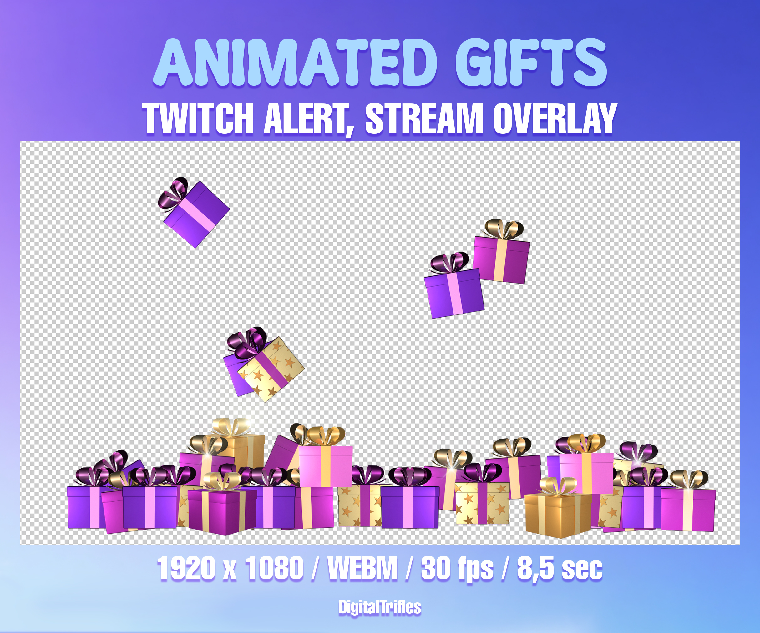 Animated gifts falling across the screen — a perfect Twitch alert or stream overlay for celebrating holidays, gift subscriptions, donations, tips, or special moments. The colorful presents bring festive cheer and joy to your stream.